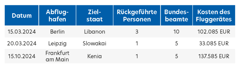 Rückführungen mit Sicherheitsbegleitung sind zeit- und kostenintensiv, auch für Liechtenstein. Besonders teuer sind Flugzeuge für Abschiebungen in kleinen Gruppen, wie die Tabelle in der Drucksache 20/14946 des Deutschen Bundestages zeigt.