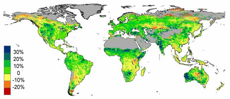 Das Bild zeigt die Veränderung der Vegetationsdichte von 1982 bis 2010 in Prozent (grün und blau bedeuten ein Wachstum der Vegetation; Wüsten und Eisflächen sind grau, © Copyright CSIRO Australia).
